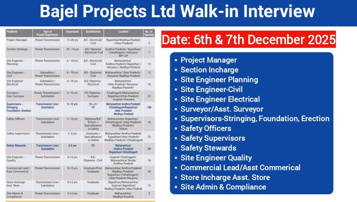 Bajel Projects Ltd Walk-In Interview at Noida | Date: 6th & 7th December, 2025 | Hiring Multiple Positions for Power Transmission Projects in Rajasthan, …