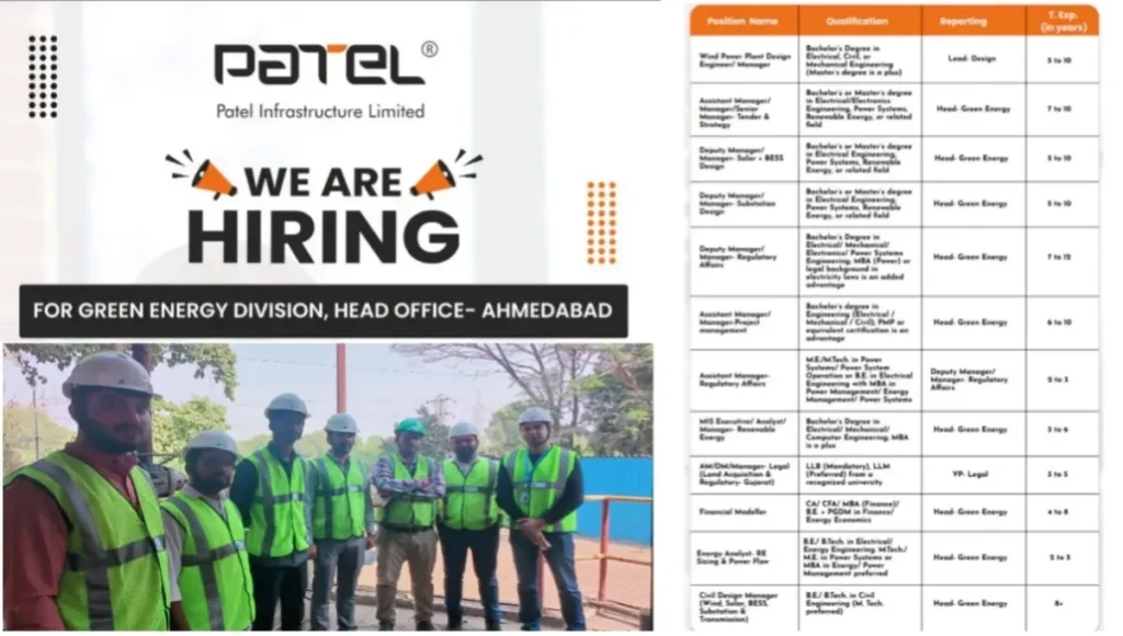 Patel Infrastructure Hiring 2025 | Green Energy Jobs in Ahmedabad Head Office