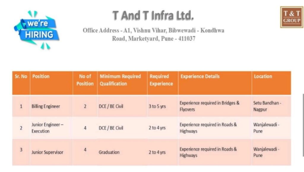 T And T Infra Ltd Recruitment 2026 | Jobs Billing Engineer, Junior Supervisor for Bridges, Flyover and Highway Projects T And T Infra Ltd … Continue reading T And T Infra Ltd Recruitment 2026 | Jobs Billing Engineer, Junior Supervisor