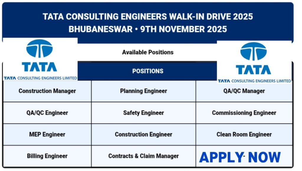Tata Consulting Engineers Walk In Drive at Bhubaneswar | Date: 9th November 2025 | Tata is inviting experienced professionals to join our growing team. … Continue reading Tata Consulting Engineers Walk In Drive at Bhubaneswar | Date: 9th November 2025 | Inviting Engineers
